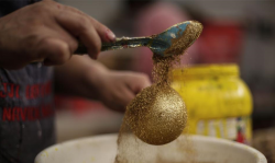 La artesana Josefina Aguilar fabrica una esfera navideña de vidrio soplado en el taller JJL Esferas Navideñas, en la Ciudad de México, capital de México, el 2 de diciembre de 2021.