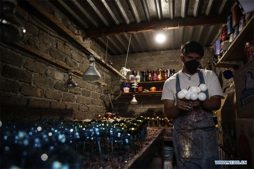 Un hombre acomoda esferas navideñas de vidrio soplado hechas a mano en el taller JJL Esferas Navideñas, en la Ciudad de México, capital de México, el 2 de diciembre de 2021.