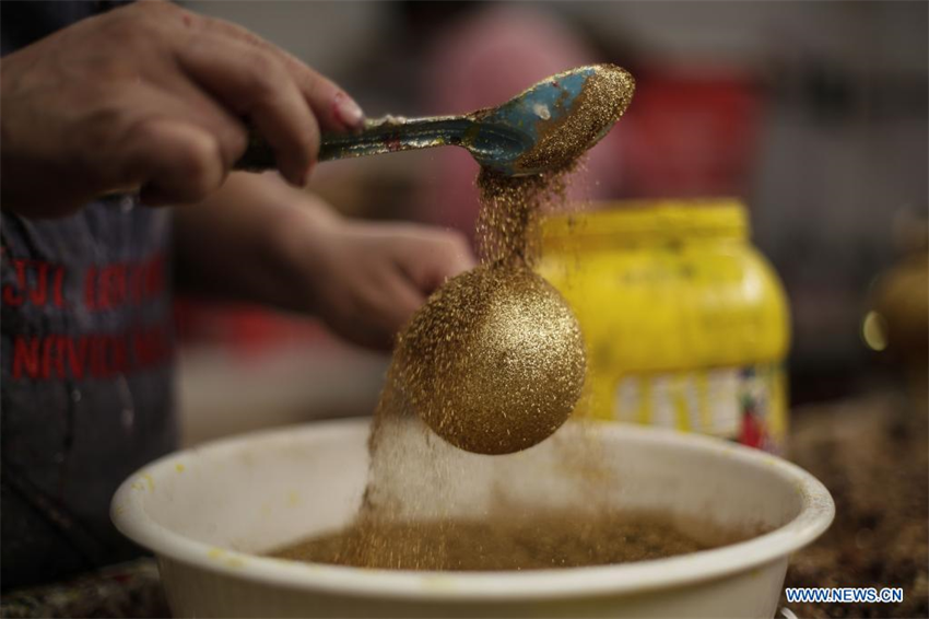 Una mujer decora una esfera navideña de vidrio soplado hecha a mano en el taller JJL Esferas Navideñas, en la Ciudad de México, capital de México, el 2 de diciembre de 2021.