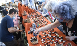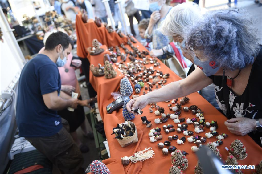 Mujeres observan productos en una feria artesanal navideña en el Parque Rodó, en Montevideo, capital de Uruguay, el 17 de diciembre de 2021.
