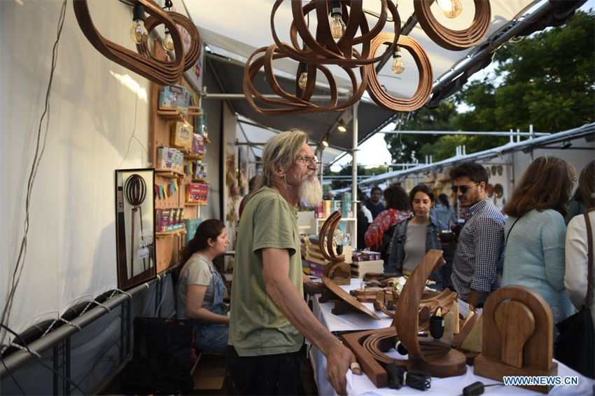 Un vendedor atiende un puesto en una feria artesanal navideña en el Parque Rodó, en Montevideo, capital de Uruguay, el 17 de diciembre de 2021.