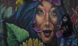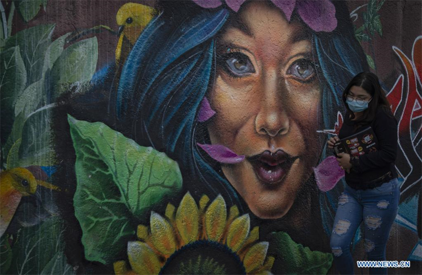 Una mujer camina frente a un mural, en Quito, capital de Ecuador, el 28 de diciembre de 2021.