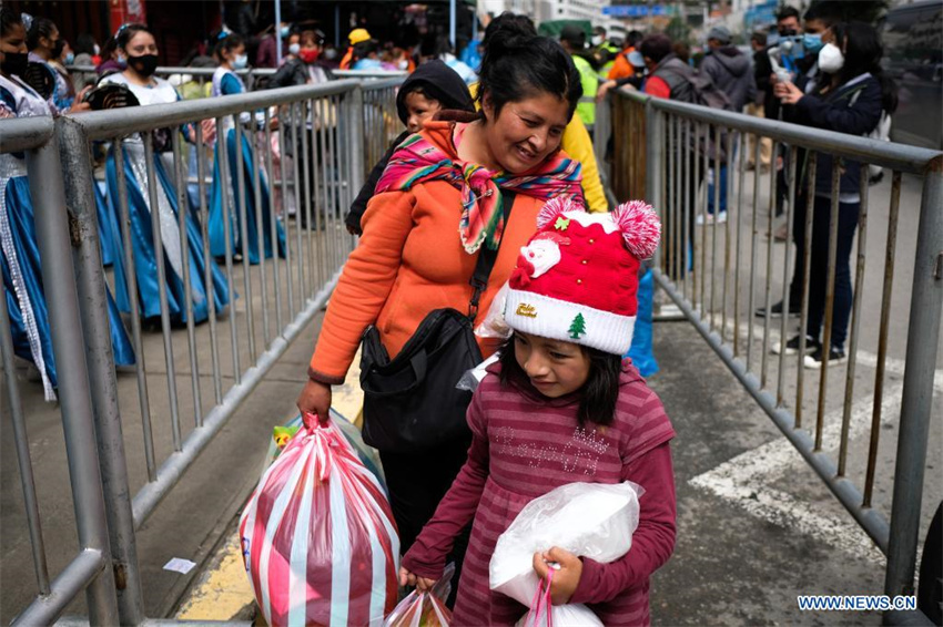 Una mujer y una niña sonríen mientras cargan bolsas con artículos entregados durante la campaña del Buen Samaritano, en La Paz, Bolivia, el 28 de diciembre de 2021. Desde hace 19 años la campaña del Buen Samaritano brinda alimentación, vestimenta y atención médica a personas de escasos recursos.