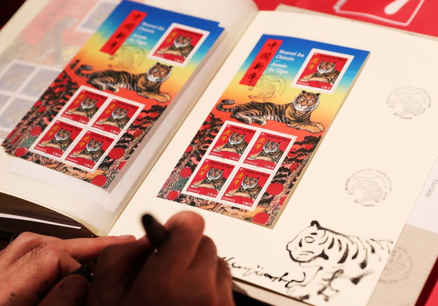 El artista chino, residente en París, Chen Jianghong, muestra los sellos conmemorativos por el Año del Tigre de diseño propio durante una ceremonia en París, Francia, el 22 de enero de 2022.