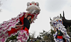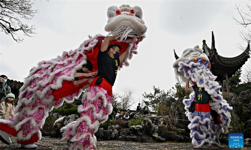 La gente realiza la danza del león durante una celebración del Año Nuevo Lunar chino en Vancouver, Canadá, el 5 de febrero de 2022.