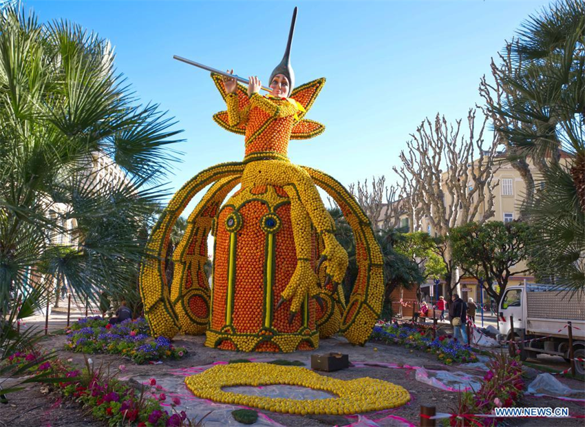 Imagen del 9 de febrero de 2022 de una instalación decorada con limones y naranjas durante los preparativos para la anual Fiesta del Limón, en Menton, Francia. La Fiesta del Limón de Menton 2022 se llevará a cabo del 12 al 27 de febrero.