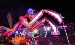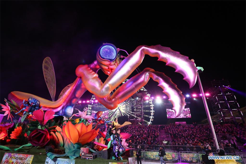 Imagen del 12 de febrero de 2022 de una carroza pasando frente a una multitud durante el 137 desfile anual del Carnaval, en Niza, Francia. El carnaval se celebra del 11 al 27 de febrero con el tema del Rey de los Animales.