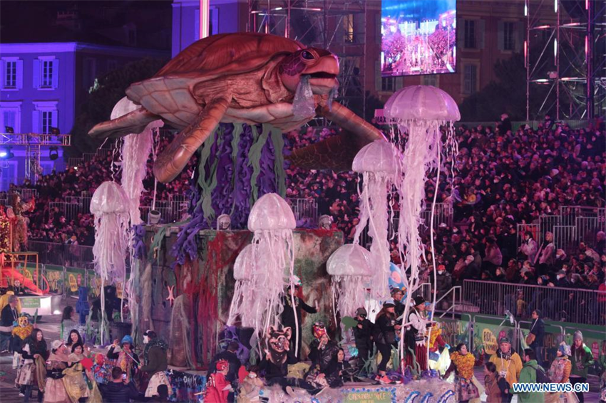 Imagen del 12 de febrero de 2022 de una carroza pasando frente a una multitud durante el 137 desfile anual del Carnaval, en Niza, Francia. El carnaval se celebra del 11 al 27 de febrero con el tema del Rey de los Animales.