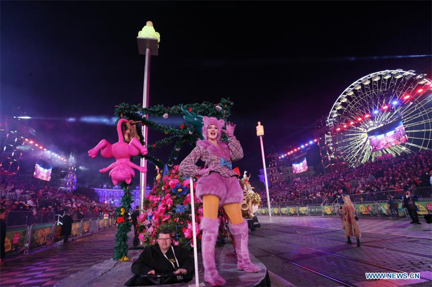 Imagen del 12 de febrero de 2022 de una carroza pasando frente a una multitud durante el 137 desfile anual del Carnaval, en Niza, Francia. El carnaval se celebra del 11 al 27 de febrero con el tema del Rey de los Animales.