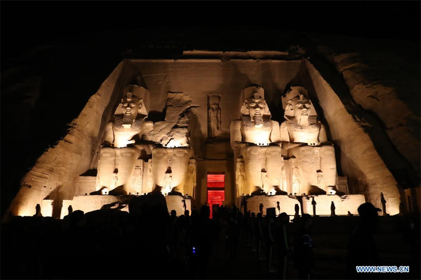 Imagen del 22 de febrero de 2022 de las esculturas del Gran Templo de Abu Simbel iluminadas durante el Festival del Sol, en Asuán, Egipto. Durante el Festival Sol, las multitudes se reúnen antes del amanecer para observar la luz solar iluminando las esculturas internas, incluido la del rey Ramses II. Las esculturas internas permanecen en la oscuridad dentro del Gran Templo de Abu Simbel durante todo el año, excepto el 22 de febrero y el 22 de octubre, cuando la luz solar baña las esculturas para conmemorar la coronación y el cumpleaños del rey.