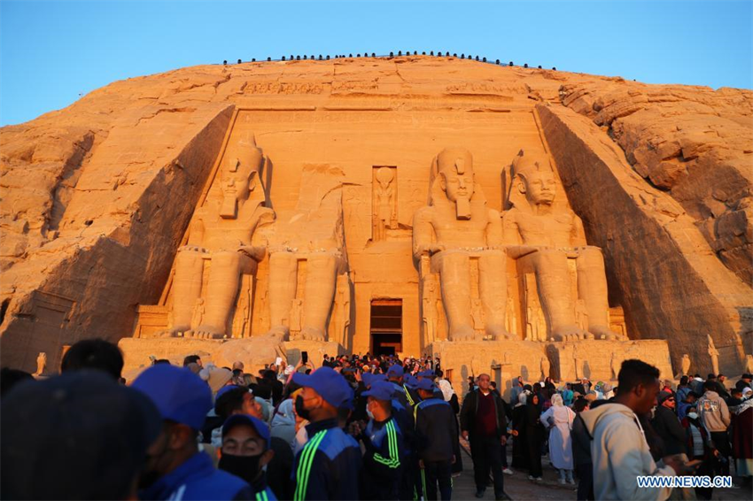 Turistas visitan el Gran Templo de Abu Simbel durante el Festival del Sol, en Asuán, Egipto, el 22 de febrero de 2022. Durante el Festival Sol, las multitudes se reúnen antes del amanecer para observar la luz solar iluminando las esculturas internas, incluido la del rey Ramses II. Las esculturas internas permanecen en la oscuridad dentro del Gran Templo de Abu Simbel durante todo el año, excepto el 22 de febrero y el 22 de octubre, cuando la luz solar baña las esculturas para conmemorar la coronación y el cumpleaños del rey.
