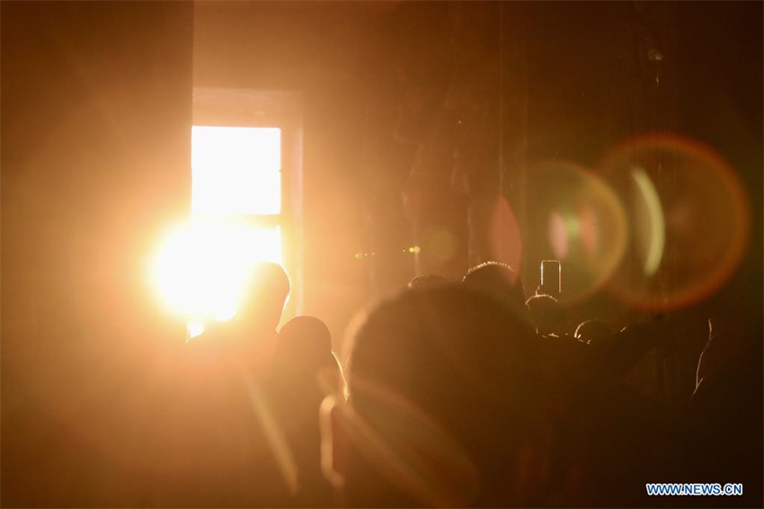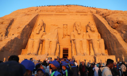 Imagen del 22 de febrero de 2022 de un rayo de luz solar bañando el Gran Templo de Abu Simbel durante el Festival del Sol, en Asuán, Egipto. Durante el Festival Sol, las multitudes se reúnen antes del amanecer para observar la luz solar iluminando las esculturas internas, incluido la del rey Ramses II. Las esculturas internas permanecen en la oscuridad dentro del Gran Templo de Abu Simbel durante todo el año, excepto el 22 de febrero y el 22 de octubre, cuando la luz solar baña las esculturas para conmemorar la coronación y el cumpleaños del rey.