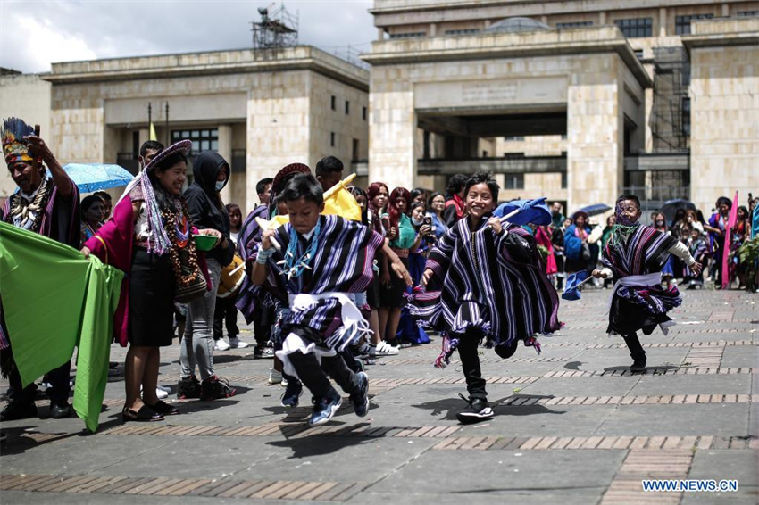 Niños de la comunidad indígena Inga participan en una ceremonia tradicional, en Bogotá, Colombia, el 1 de marzo de 2022.