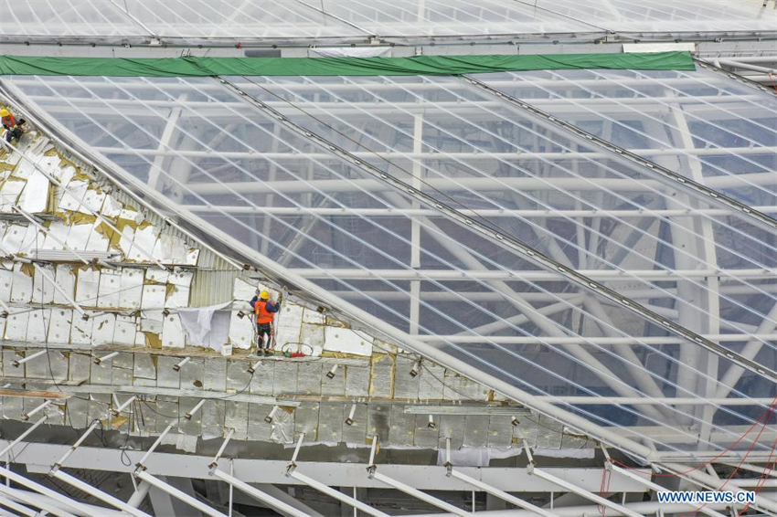 Vista aérea del 29 de marzo de 2022 del sitio de construcción del estadio de fútbol Longxing de Chongqing, en la municipalidad de Chongqing, en el suroeste de China. La construcción del techo y decoración del estadio de fútbol Longxing de Chongqing ha llegado a su etapa final. Cuando el estadio de fútbol esté terminado podrá albergar a 60.000 espectadores.