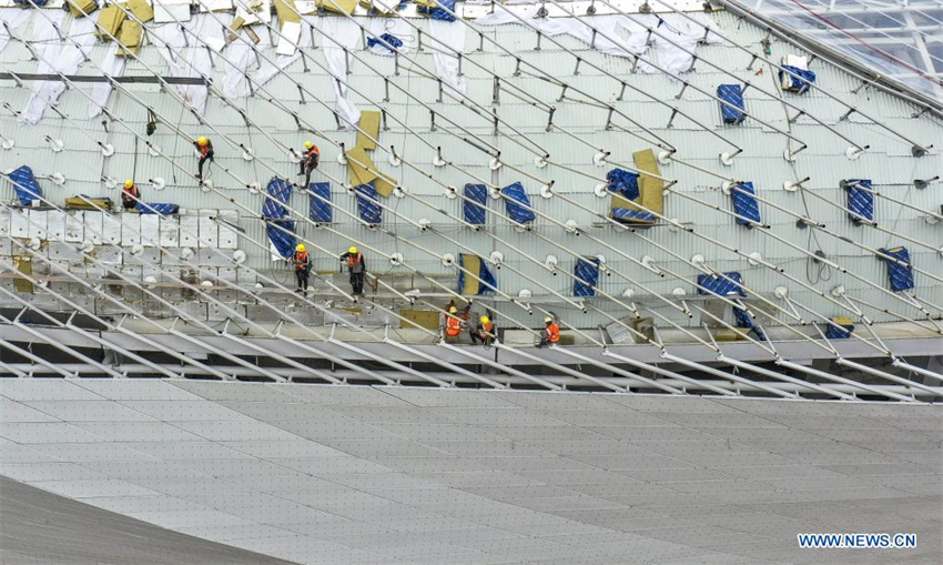 Vista aérea del 29 de marzo de 2022 del sitio de construcción del estadio de fútbol Longxing de Chongqing, en la municipalidad de Chongqing, en el suroeste de China. La construcción del techo y decoración del estadio de fútbol Longxing de Chongqing ha llegado a su etapa final. Cuando el estadio de fútbol esté terminado podrá albergar a 60.000 espectadores.