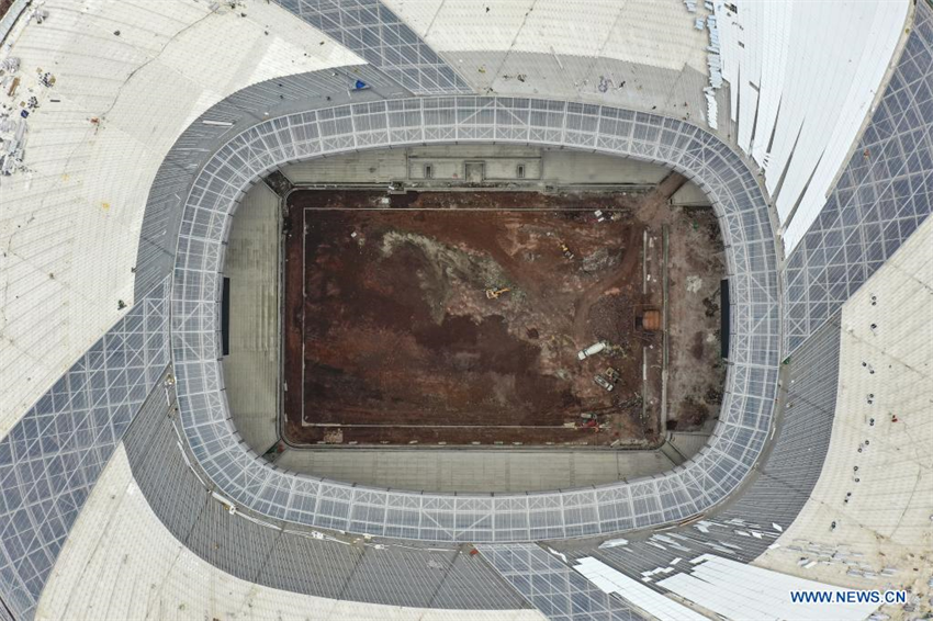 Vista aérea del 29 de marzo de 2022 del sitio de construcción del estadio de fútbol Longxing de Chongqing, en la municipalidad de Chongqing, en el suroeste de China. La construcción del techo y decoración del estadio de fútbol Longxing de Chongqing ha llegado a su etapa final. Cuando el estadio de fútbol esté terminado podrá albergar a 60.000 espectadores.