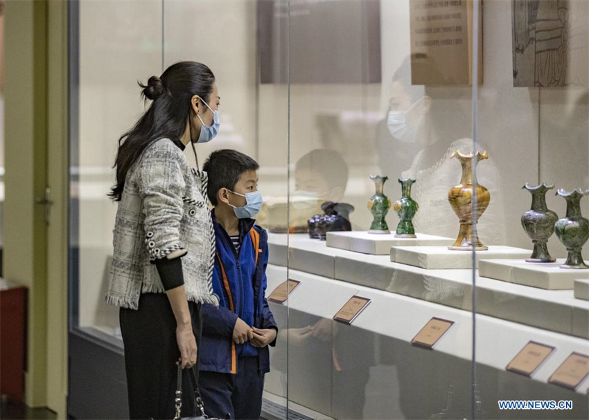 Personas visitan una exposición en el Museo de las Tres Gargantas de Chongqing, en Chongqing, en el suroeste de China, el 17 de abril de 2022. La exposición muestra preciosas reliquias culturales, entre las que se incluyen objetos de bronce, cerámica, muebles y murales de las dinastías Liao (907-1125), Jin (1115-1234) y Yuan (1271-1368).