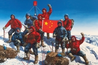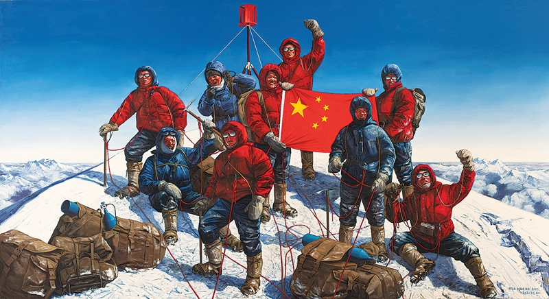 "Escalando el Qomolangma" es una pintura al óleo de Zhang Zhijian, Liu Haiyang, Zhang Jian y Li Taoran de la Academia de Bellas Artes de Luxun y representa el segundo ascenso de un equipo de montañismo chino al pico conocido como Everest en Occidente.