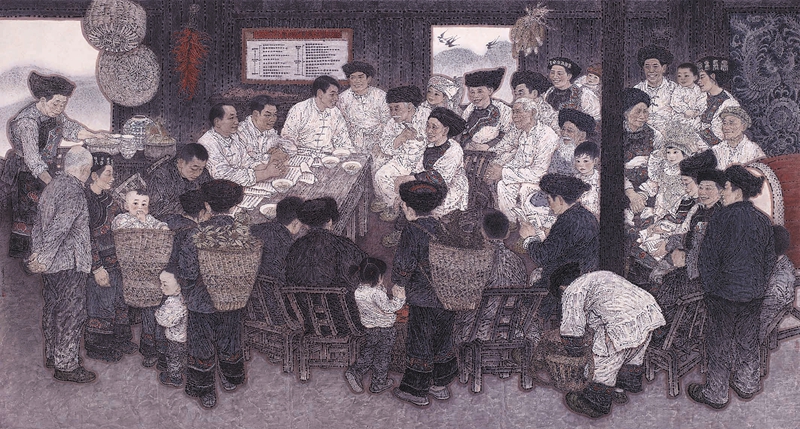 "Momento conmovedor", tinta y color de Wang Fenying de la Academia de Arte de China, representa una reunión para políticas específicas de alivio de la pobreza a favor de los residentes de la aldea de Shibadong en la provincia de Hunan. La identificación precisa de los más necesitados y las medidas ajustadas a su situación son cruciales para erradicar este mal. China ha emitido una serie de directrices para elevar el nivel de eficiencia tomando como punto de partida la identificación de las personas que requieren ayuda.