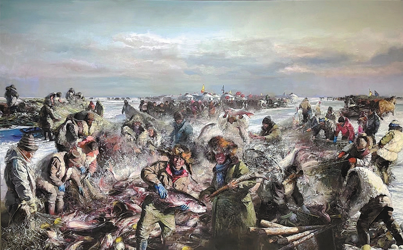 "Temporada de cosecha", la obra al óleo de Ji Yunhui, Zhang Guanyi, Li Pengpeng, Chen Xu y Wang Teng de la Academia de Bellas Artes de Luxun muestra el entusiasmo por la captura del día.