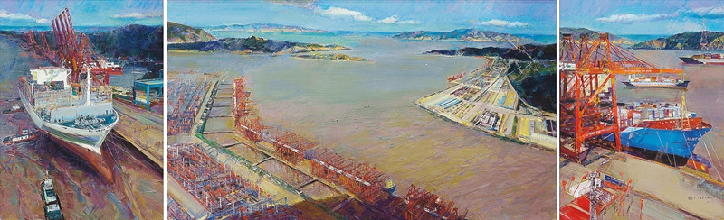 "El puerto de Ningbo Zhoushan" de Yang Canjun, Lu Jiahua y Wang Minjie de la Academia de Arte de China refleja la intensa actividad del lugar en un tríptico. El puerto en la provincia de Zhejiang ha sido uno de los centros de carga más activos del mundo y el segundo puerto más grande de China.