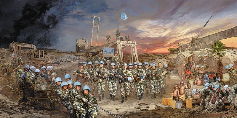 "Por la paz" de Li Zhuo y Ding Yongsheng de la Academia de Bellas Artes Luxun presenta el apoyo de China a África durante una operación de mantenimiento de la paz de la ONU. Los artistas tomaron dos años y medio para recrear la escena en lienzo.