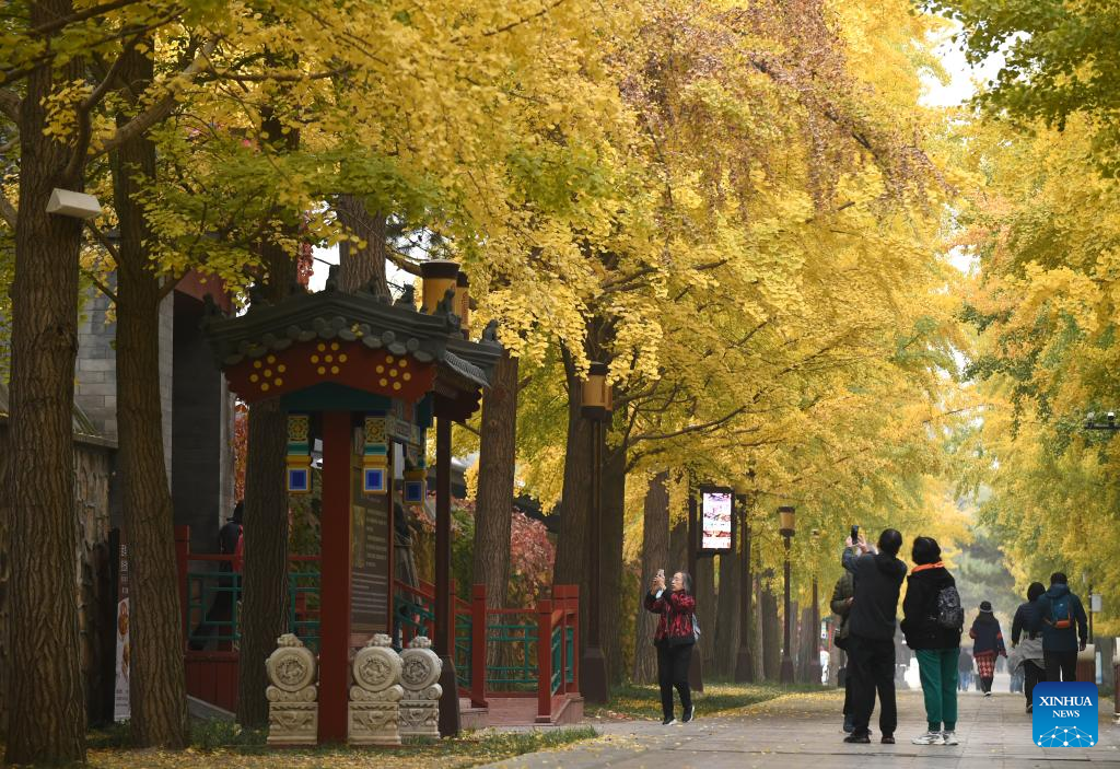 Turistas toman fotos bajo árboles de ginkgo en el parque Yuanmingyuan, o el antiguo Palacio de Verano, en Beijing, capital de China, el 26 de octubre de 2022.