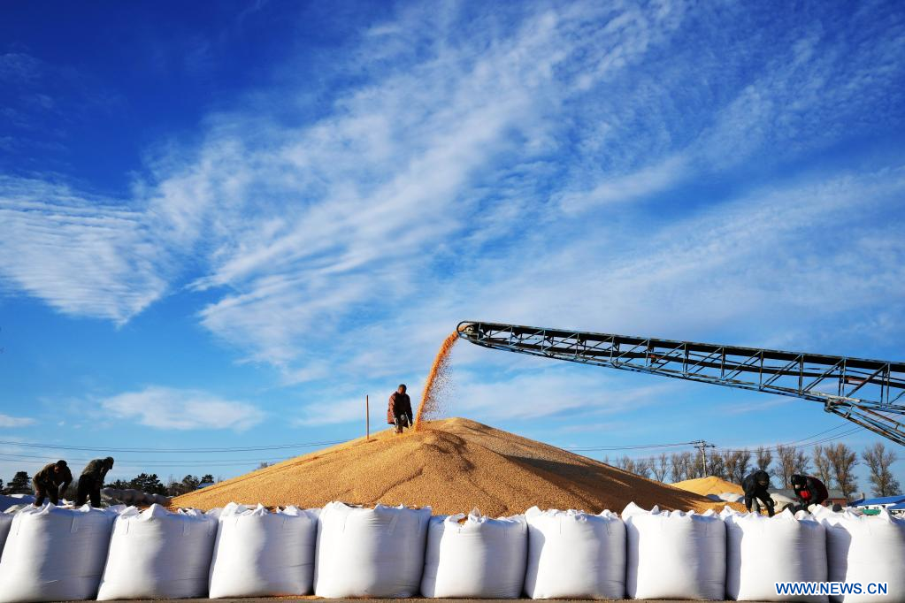Imagen del 19 de octubre de 2022 de un trabajador laborando sobre una pila de maíces en un patio de secado, en Bei'an, en la provincia de Heilongjiang, en el noreste de China.