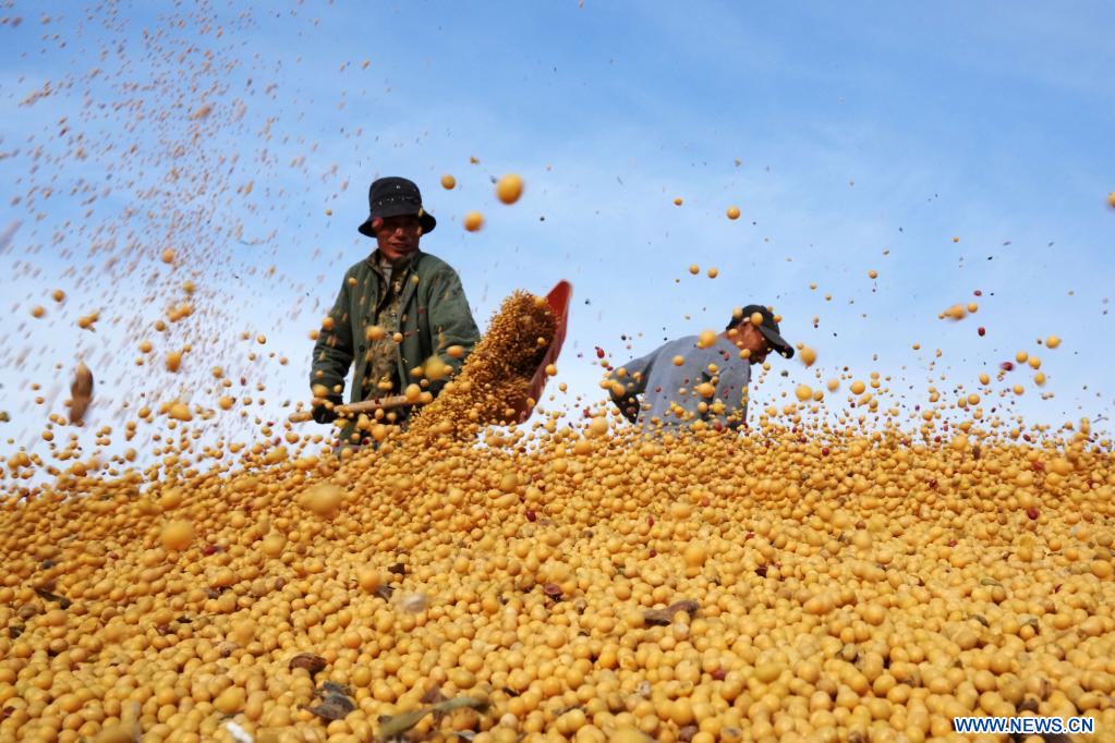 Imagen del 20 de octubre de 2022 de trabajadores laborando en una pila de frijoles de soja en un patio de secado, en Bei'an, en la provincia de Heilongjiang, en el noreste de China.