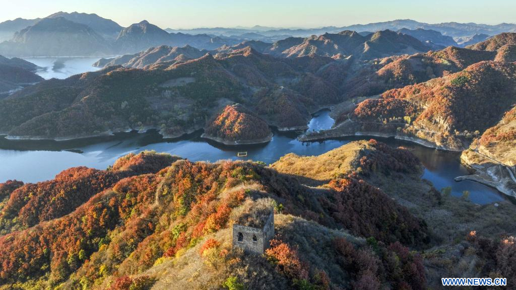 Vista aérea del 24 de octubre de 2022 del paisaje de otoño de una sección de la Gran Muralla, en la provincia de Hebei, en el norte de China.
