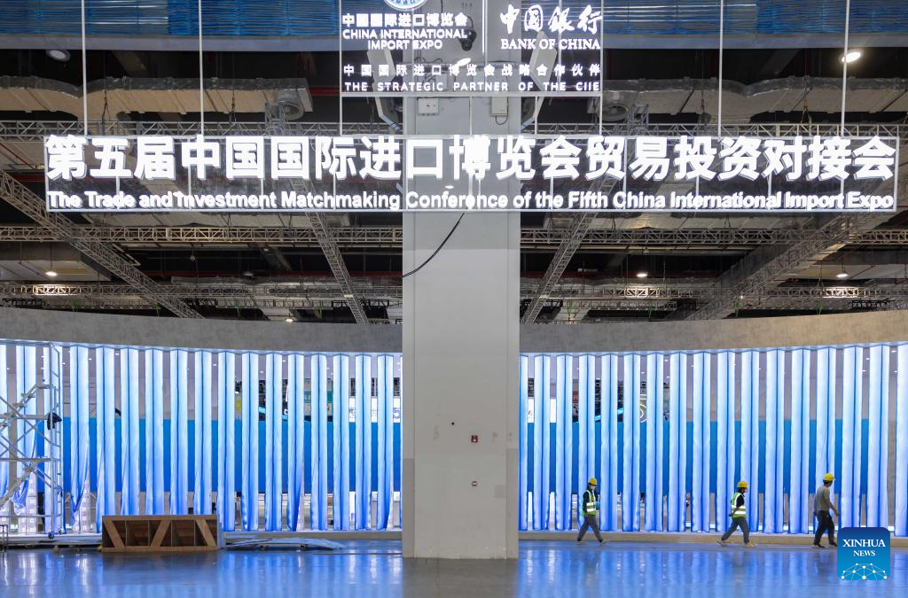 Foto tomada el 31 de octubre de 2022 muestra un área de exhibición en el Centro Nacional de Exposiciones y Convenciones en Shanghai, la sede principal de la Exposición Internacional de Importaciones de China (CIIE, por sus siglas en inglés). La V CIIE está programada para llevarse a cabo del 5 al 10 de noviembre.