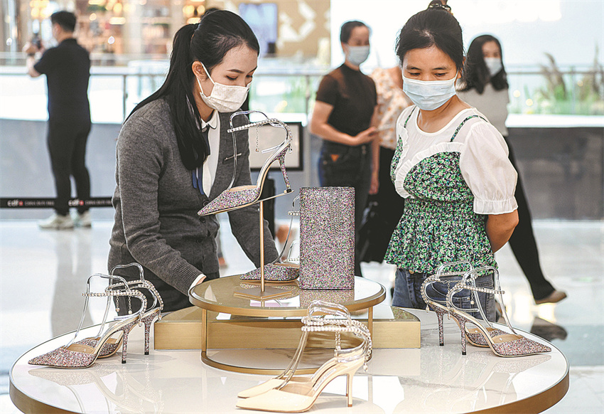 Una vendedora (izquierda) presenta calzado de lujo a una consumidora en el complejo comercial Ciudad Internacional Libre de Impuestos de Haikou, inaugurada el viernes.