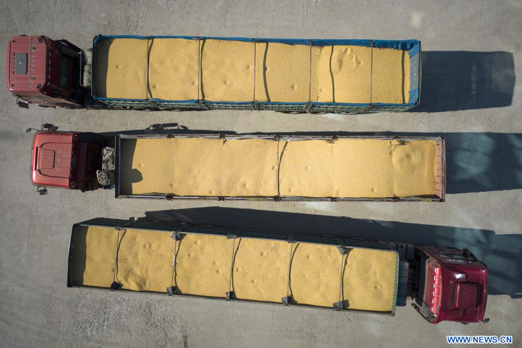 Vista aérea del 25 de octubre de 2022 de algunos camiones cargados con soja recién cosechada en una empresa comercializadora de granos, en Suihua de la provincia de Heilongjiang, en el noreste de China. Heilongjiang, una importante provincia productora de cereales en China, ha registrado recientemente una abundante cosecha de soja.