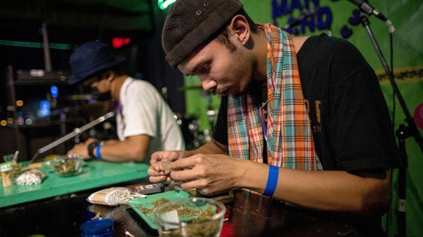 En un pequeño café para consumidores de cannabis, un grupo de fumadores se reúnen para intentar hacerse con uno de los tres premios del campeonato: el porro más rápido, el más creativo y la mejor variedad de cannabis tailandés.