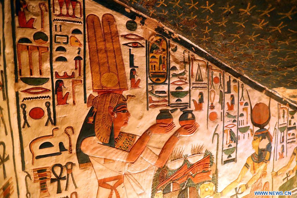 Imagen del 24 de enero de 2023 de una pintura mural de "Nefertari" en el interior de la tumba de Nefertari en el Valle de las Reinas, en Luxor, Egipto. Nefertari es la esposa del famoso faraón Ramsés II del antiguo Egipto. Construida hace más de 3.000 años, la tumba es famosa por sus pinturas murales con colores vivos. Fue descubierta en 1904 y reabierta a los turistas en 2016 después de años de restauración. (Xinhua/Sui Xiankai)