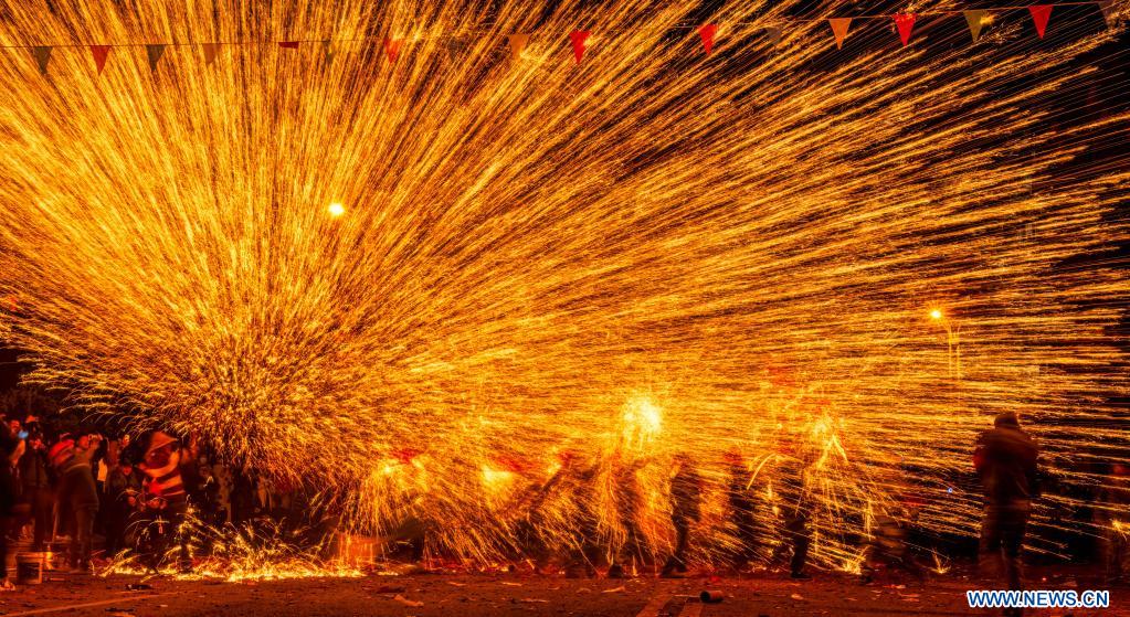 Imagen del 30 de enero de 2023 de artistas folclóricos interpretando "flores de hierro", un espectáculo en el que se lanza hierro fundido para crear fuegos artificiales, en celebración del próximo Festival de las Linternas, en el municipio de Goujiang del distrito de Bozhou, en la ciudad de Zunyi, en la provincia de Guizhou, en el suroeste de China. El Festival de las Linternas, el día 15 del primer mes del calendario lunar chino, cae el 5 de febrero este año. El festival incluye reuniones familiares, festines, espectáculos de luz y diversas actividades culturales.