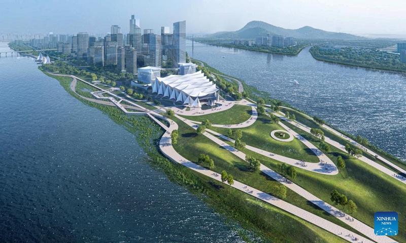 Representación arquitectónica de la sede permanente del Foro Científico de la Gran Área de la Bahía en el distrito de Nansha en Guangzhou, provincia de Guangdong, sur de China.