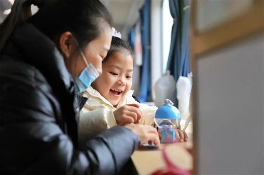 Wen Chenyi, de 5 años, lee poesía antigua y juega con su madre en el tren.
