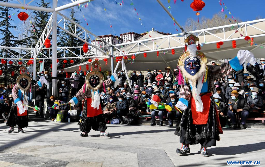 Actores realizan una presentación de un drama clásico tibetano, en Lhasa, en la región autónoma del Tíbet, en el suroeste de China, el 25 de febrero de 2023. Un evento de drama tibetano de cinco días de duración comenzó en Lhasa el 22 de febrero para celebrar el Año Nuevo Tibetano.