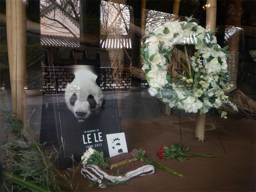 El panda gigante Le Le y algunas ofrendas florales en el zoológico de Memphis, Estados Unidos, 4 de febrero de 2023.