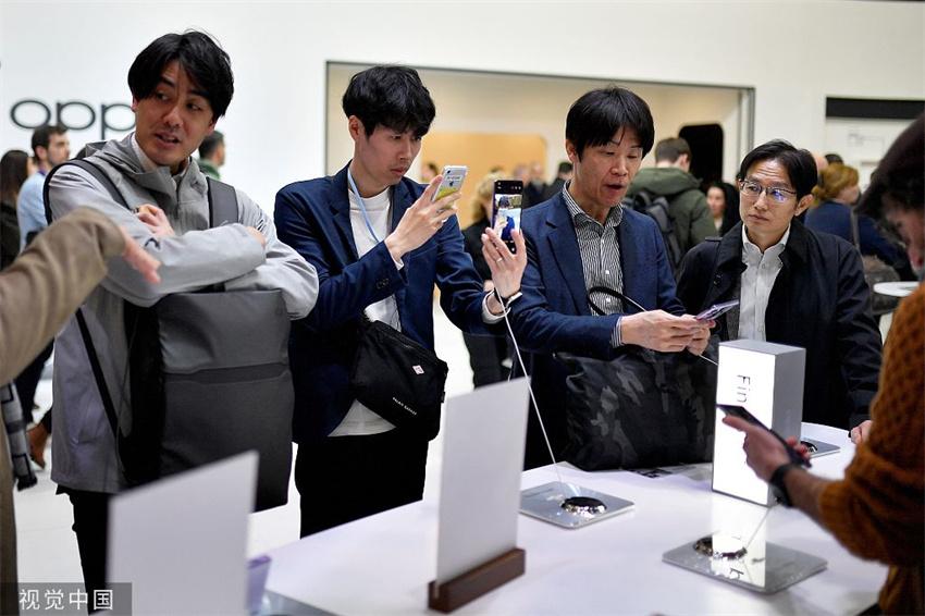Visitantes observan los dispositivos Find Serie del fabricante chino Oppo en el Mobile World Congress 2023 en Barcelona, España, 27 de febrero de 2023.