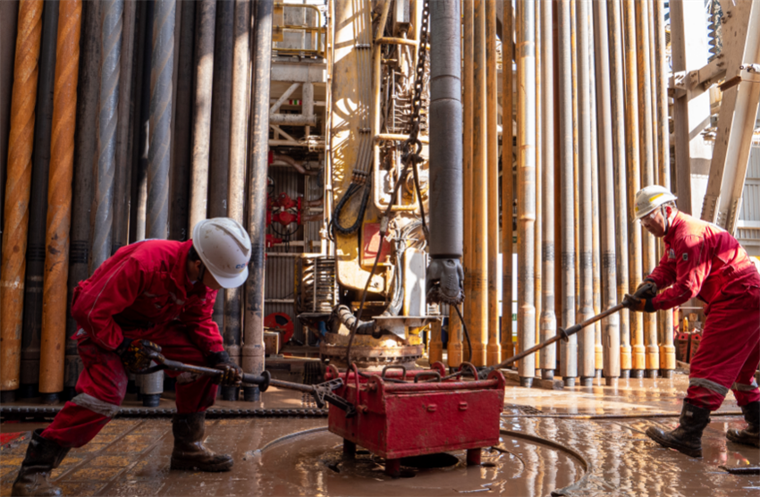 Dos trabajadores de CNOOC operan una perforadora en una plataforma marina. Foto cortesía de CNOOC