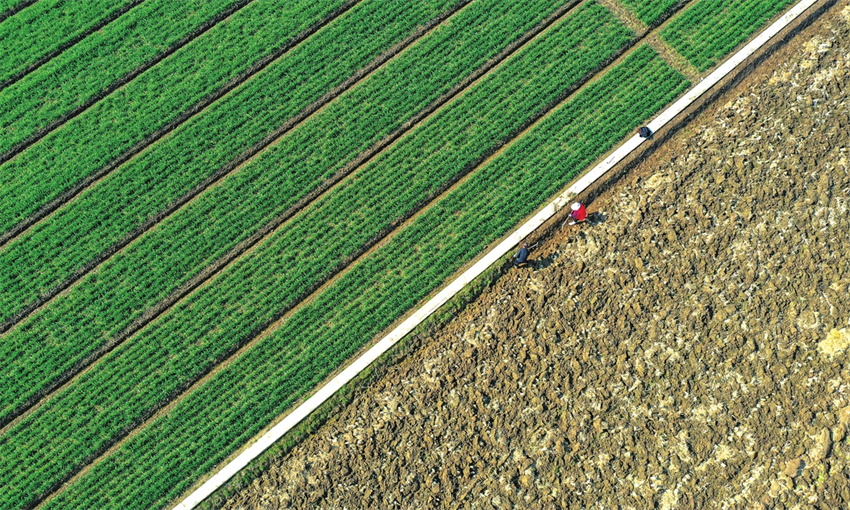 Agricultores del Instituto Lixiahe de Ciencias Agrícolas de la Academia de Ciencias Agrícolas de Yangzhou aran y administran campos modelo en Yangzhou, provincia oriental de Jiangsu, 20 de febrero de 2023.