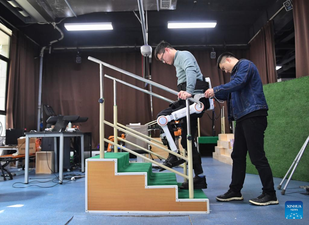 Un parapléjico prueba un exoesqueleto robótico para entrenamiento de rehabilitación en el suroeste de China