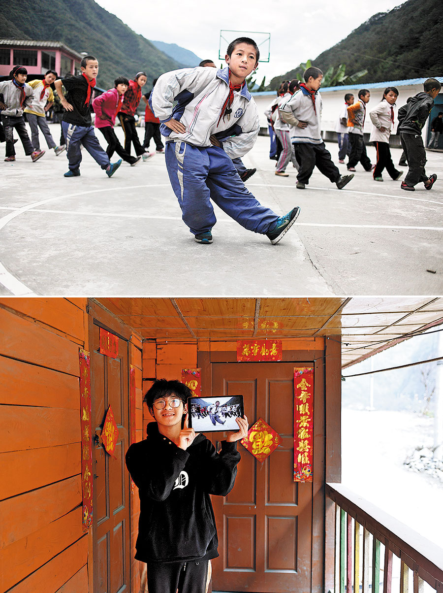 Kong Jihong, entonces estudiante de cuarto grado en la escuela de primaria y secundaria del municipio, hace ejercicios con música durante un intervalo de clases, fotografiado el 20 de octubre de 2012; Kong, ahora estudiante de segundo año en la Universidad Dalian Minzu, en su casa en la aldea de Kongmei el 7 de febrero de este año. (Foto de Wang Jing/China Daily.)