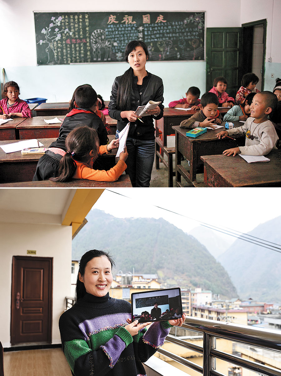 La profesora de matemáticas Wang Xiaotao imparte una clase el 20 de octubre de 2012; Wang en su casa en el distrito de Gongshan el 9 de febrero de este año. (Foto de Wang Jing/China Daily.)