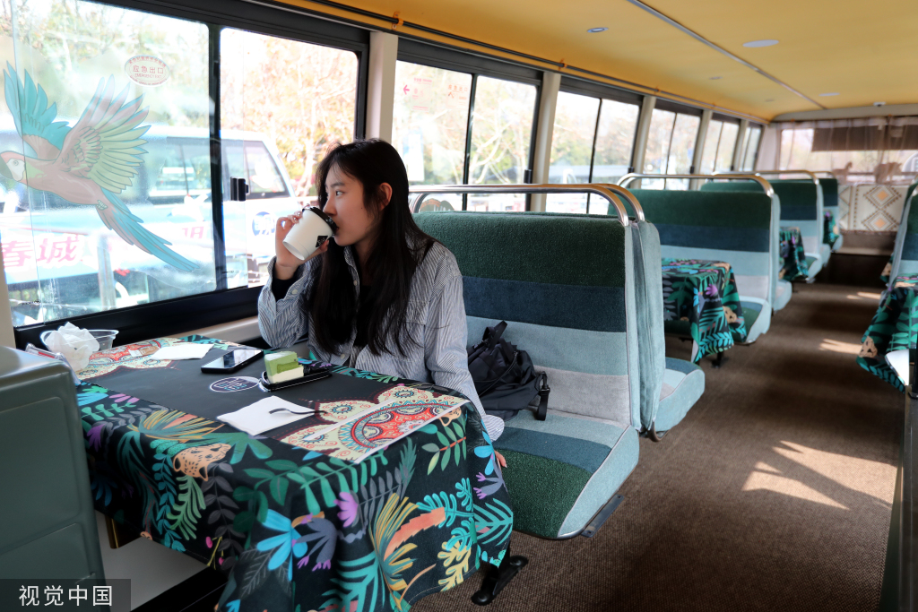 Una mujer toma café en una cafetería-autobús de Kunming, en la provincia de Yunnan, el 7 de marzo de 2023. (Foto/VCG.)