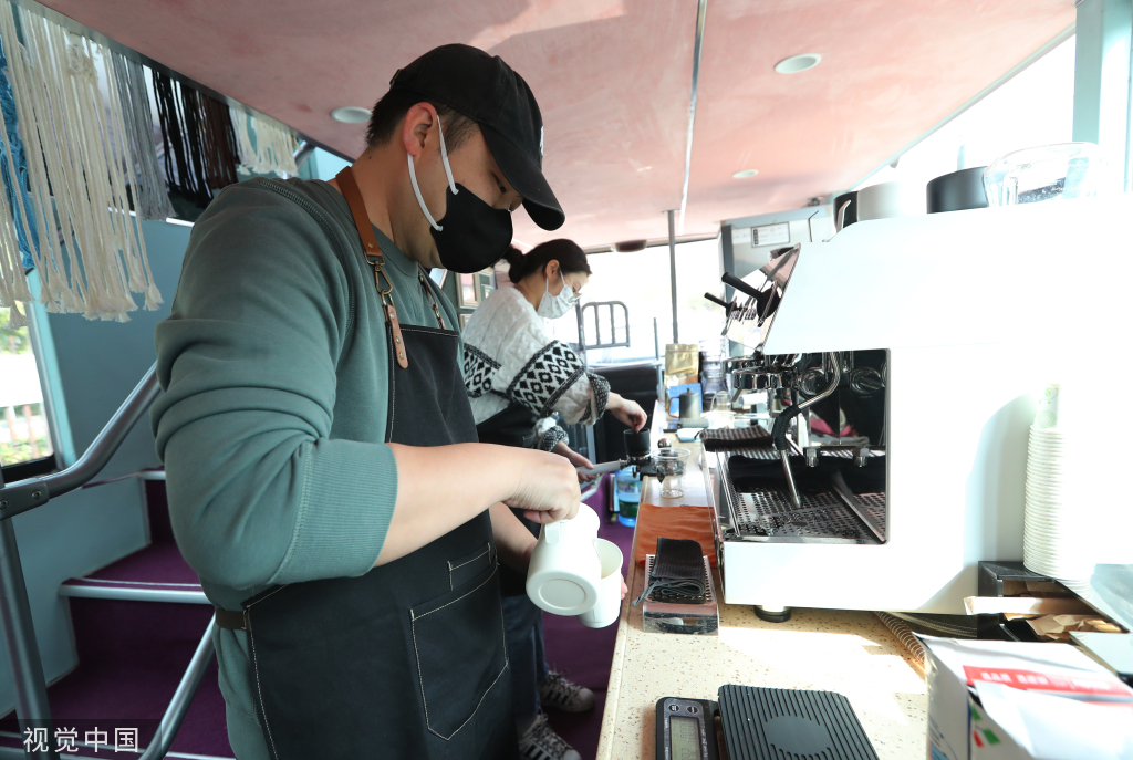 Un hombre prepara café en una cafetería-autobús en Kunming, provincia de Yunnan, el 7 de marzo de 2023. (Foto/VCG.)