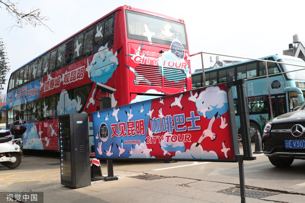 Una cafetería-autobús aparca en la estación de autobuses Haigeng Daba en Kunming, en la provincia de Yunnan, el 7 de marzo de 2023. (Foto/VCG.)