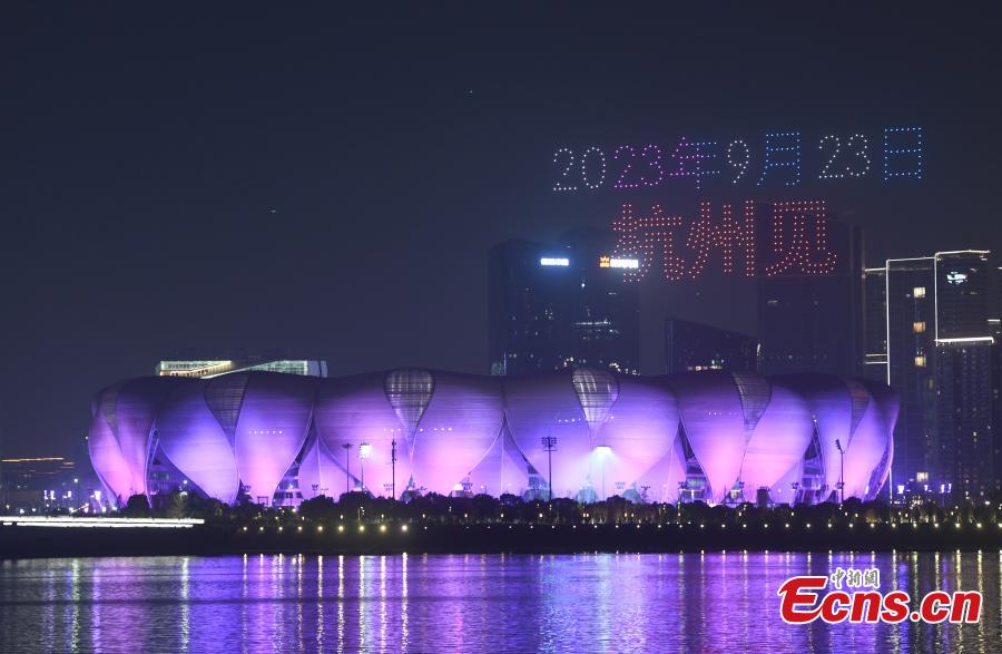 Un espectáculo de luces con los emblemas de Hangzhou iluminó la ciudad con 500 drones para dar inicio a la cuenta atrás de 200 días de los Juegos Asiáticos Hangzhou 2022 en el Estadio Central de Deportes Olímpicos de Hangzhou, apodado “el Gran Loto”, en la provincia oriental china de Zhejiang, 7 de marzo de 2023.